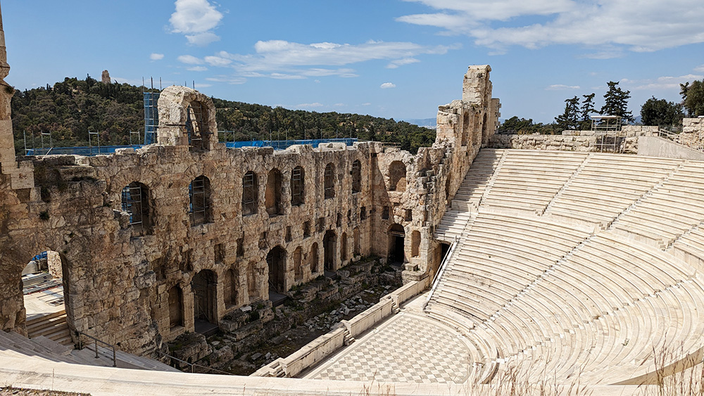 en uiteindelijk naar het Parthenon, nog altijd in restauratie maar indrukwekkend door zijn proporties en subtiele architectonische correcties. Het Erechtheion met zijn kariatiden sluit de rondgang over de Acropolis af.