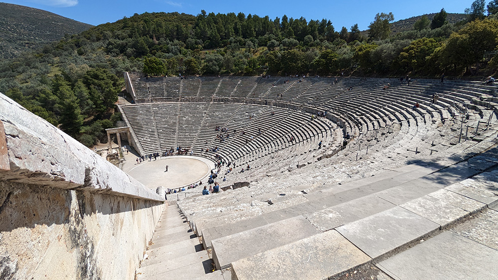 nu vooral beroemd om zijn theater. De akoestiek is zo perfect dat een muntstuk dat op de stenen vloer valt, bovenin de tribune hoorbaar is.