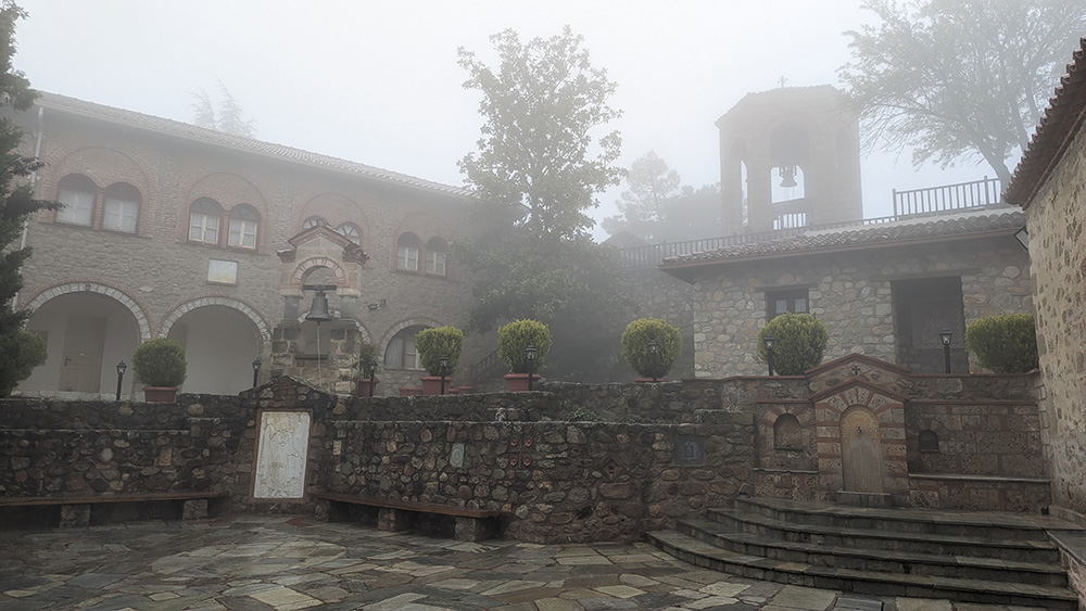 Het Megalo Meteoron klooster in de mist (foto: CVR Magazine)