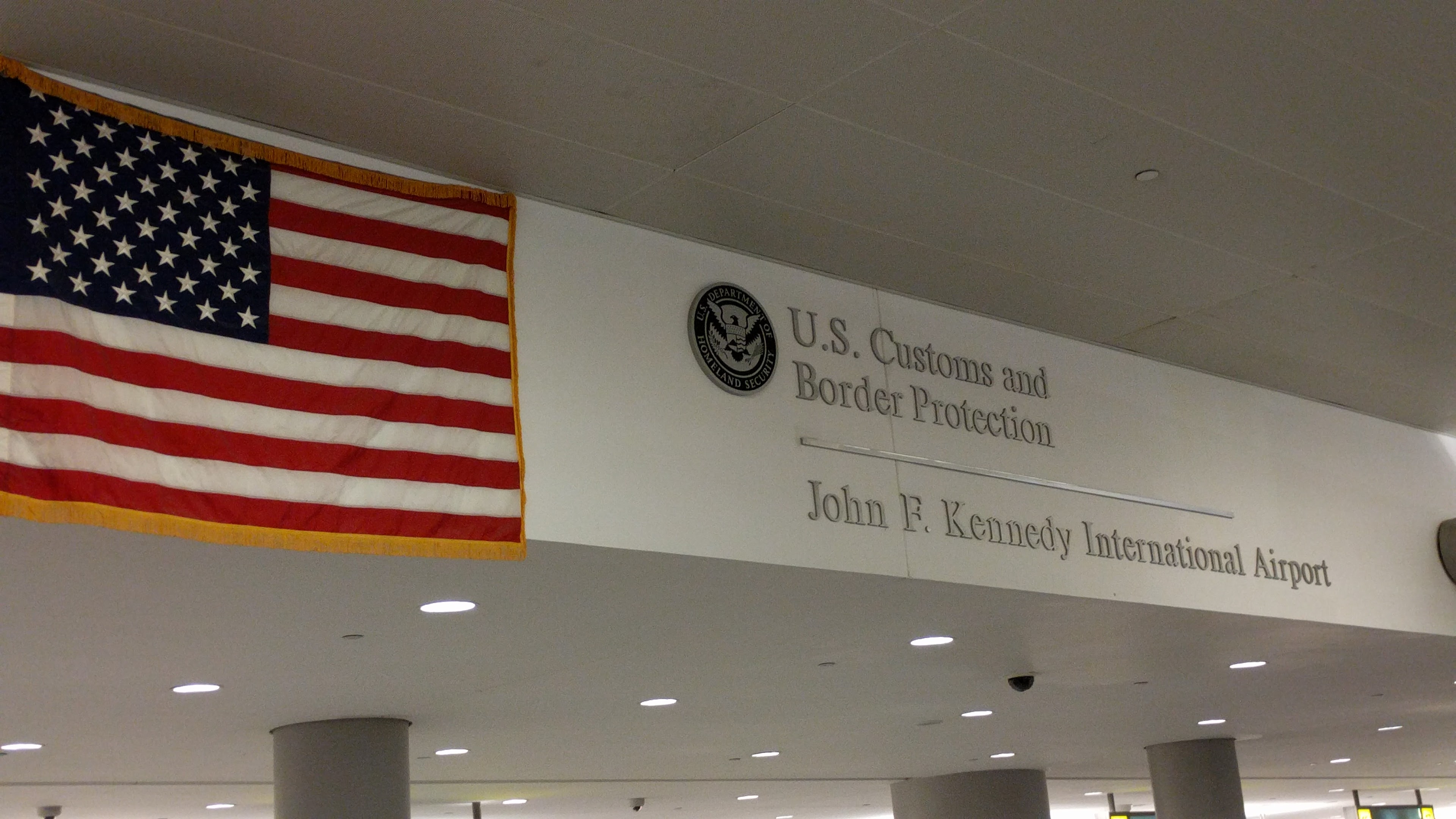 Wanneer je landt op John F. Kennedy International Airport dan ben je nog niet helemaal in de Verenigde Staten van Amerika. Je moet eerst nog door de douane en dat kan een tijdrovende zaak zijn. Let erop dat je in de rij gaat staan van Non-US Citizens. Je komt dan in een (lange) wachtrij en wordt één voor één naar voren geroepen bij een loket. Hier beoordeelt een douanebeambte aan de hand van vragen of je tot de Verenigde Staten toegelaten wordt. Belangrijke voorwaarde hiervoor is je ESTA, maar die geeft echter geen garantie. De beambte beslit. Bij de controle worden je vingerafdrukken vastgelegd en wordt er een foto gemaakt. Deze biometrische gegevens gebruikt de Amerikaanse overheid om te bepalen wie het land inreist en stelt de overheid in staat om je verder op je reis te kunnen volgen. Kinderen tot 14 jaar hoeven geen vingerafdrukken en foto af te geven.