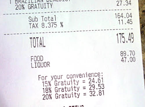 Bekijk het bonnetje wel eerst goed, want soms is er al fooi (gratuity) in rekening gebracht. Soms wordt daarnaast ruimte geboden om een extra tip of gratuity in te vullen (of er wordt een suggestie gedaan), maar dit hoef je niet te doen.Voorbeeld van een kassabon waarbij twee keer de fooi wordt berekendTap water