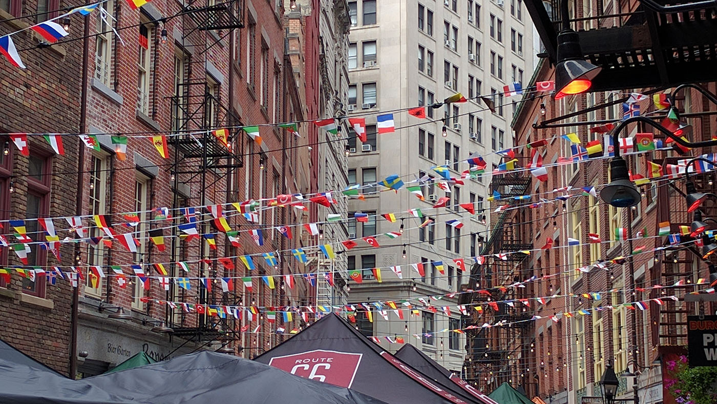Loop nu via de linkerkant (Whitehall Street) terug naar Staten Island Ferry tot je aan Stone Street komt. Hier sla je linksaf en loopt door tot het einde. Nu loop je links om het gebouw waar je tegenaan loopt en dan kom je in het oude gedeelte van Stone Street.
