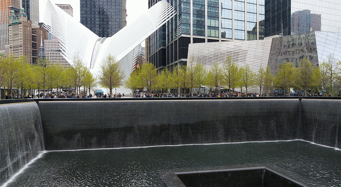 Naast het One World Trade Center ligt het National September 11 Memorial & Museum. Dit monument bestaat uit twee laaggelegen bassins op de plek waar voorheen de Twin Towers stonden. Op de rand staan de namen van de slachtoffers. De bassins worden continue gevuld met water dat langs de binnenmuren naar beneden stroomt.