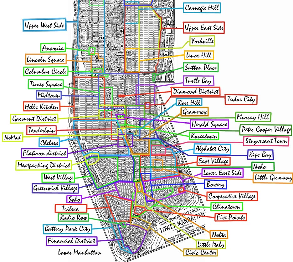 Manhattan heeft een vrij logische indeling waardoor je snel de weg kunt vinden. Het eiland kent "Streets" (straten) en "Avenues" (lanen). De Streets lopen horizontaal over het eiland en de Avenues lopen verticaal. Nagenoeg alle Streets en Avenues hebben een nummer waarbij de Avenues van oost naar west in nummer oplopen en de Streets van het zuiden naar het noorden oplopen.De meest oostelijke Avenue is 1th Avenue en de westkant aan de Hudson River ligt 12th Avenue. Zoals gezegd tellen de straten vanaf het zuiden naar boven op,