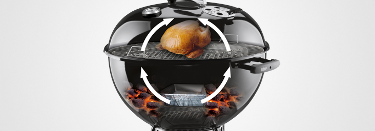 Weber is uitermate geschikt voor het indirect grillen van grotere stukken vlees, zoals bijvoorbeeld een hele kip. Omdat de barbecue met een deksel gesloten wordt, blijft de warme lucht behouden en gaart het vlees gelijkmatig. Wanneer je echter een mooi korstje wilt dan leg je het vlees in het begin wel boven de kolen en laat het daarna boven het druipbakje gaar worden.