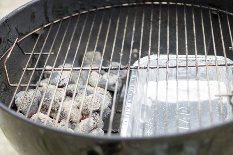 Leg de briketten aan de zijkant van de ketel op het onderste rooster en in het midden een aluminium druipbakje. Vetten en sappen lekken dan in het druipbakje. Giet een beetje water in het bakje om eventuele vervelende rookontwikkeling te voorkomen. Bij de kleinere modellen gebruik je ene helft voor de briketten en plaats je het druipbakje op de andere helft. Heb je geen bakje dan is bij een klein formaat barbecue aluminiumfolie een goed alternatief. Let er wel op dat je dikke (extra sterke) folie gebruikt omdat de normale aluminiumfolie niet bestand is tegen de hitte in de ketel. Neem wat meer folie zodat je de randen naar boven kunt buigen, zodat de sappen in de folie blijven.