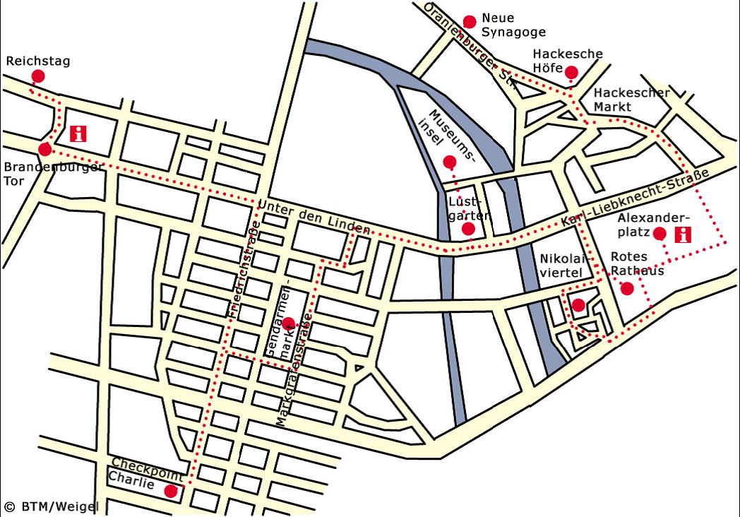museum dat een goed beeld geeft van Berlijn tijdens de koude oorlog. Loop vervolgens terug door de Friedrichstrasse en sta even stil bij de kruizen die opgericht zijn ter nagedachtenis aan de inwoners van de DDR die geprobeerd hebben naar de BRD te vluchten en daarbij om het leven zijn gekomen.