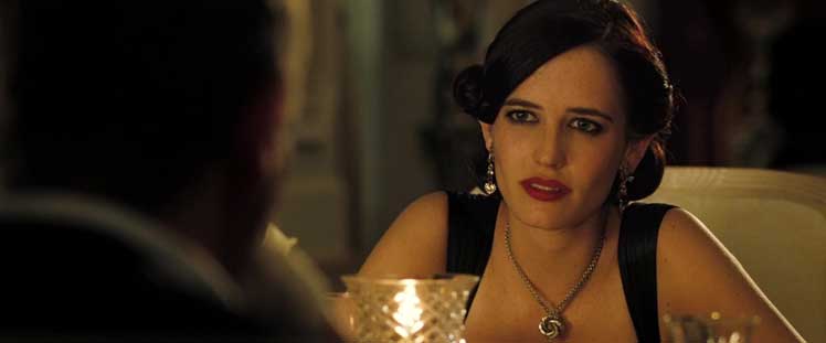 James Bond heeft een indringend gesprek met Vesper Lynd onder genot van een cocktail.