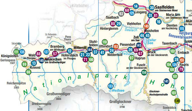 Vanuit Uttendorf in het Salsachdal rijdt je naar Enzingerboden. Hier stap je in de gondel naar de Weißsee op 2.300 meter. Vanaf daar gaat een stoeltjeslift verder omhoog naar de Medelskopf op 2.760 meter waar je zicht hebt op de Großglockner.