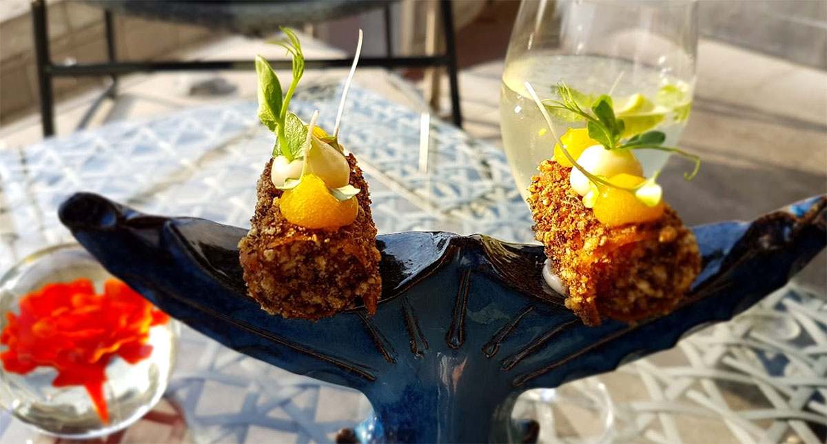 Komkommer, vermouth, geitenkaas, sardiene, groene olijf en mint