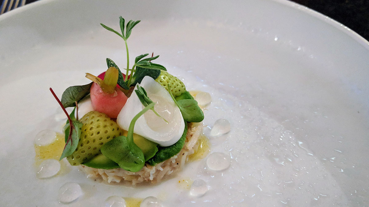 Noordzee krab, avocado, kerrie, radijs, onrijpe aardbei, geitenyoghurt