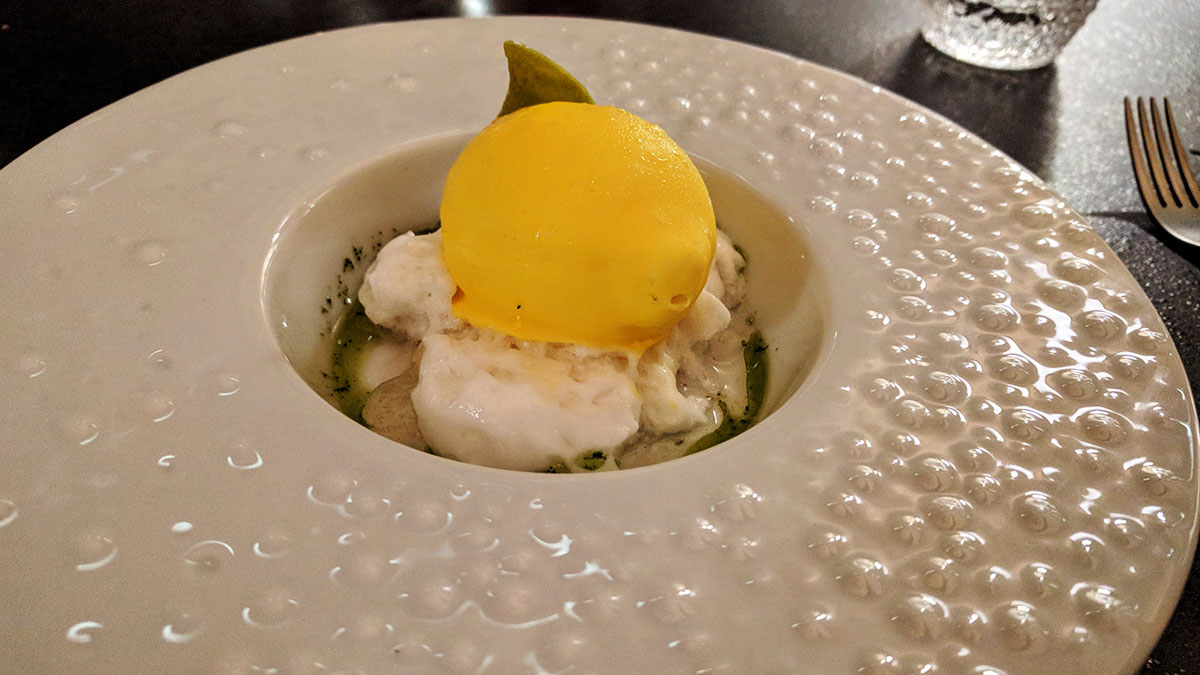 Oester, spitskool, wakame, miso, ganzenlever en sake