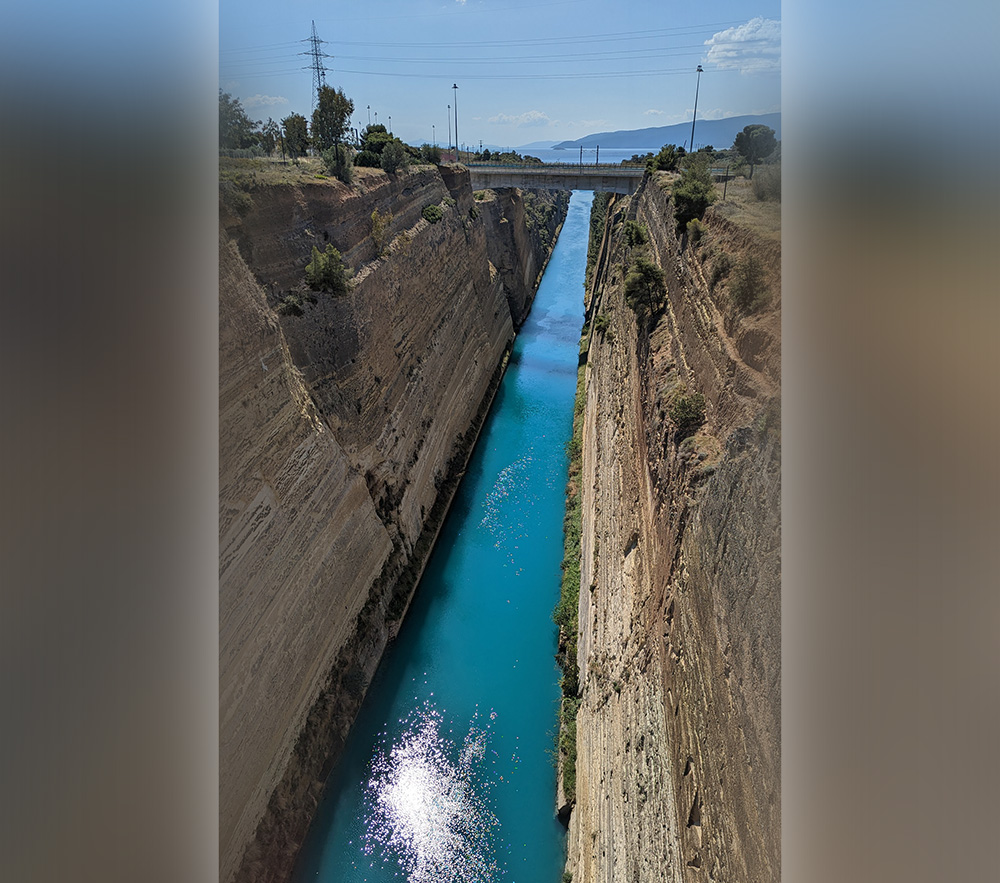 De route naar de Peloponnesos voert langs het kanaal van Korinthe, een smalle snee door het land, gegraven tussen 1881 en 1893. Met de komst van dit kanaal werd de route van de Egeïsche zee naar de Adriatische zee met 131 nautische mijlen verkort.