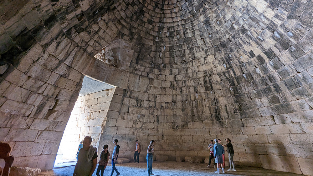 De grafkamer van Atreus of Agamemnon is een koepelgraf dat zich onder een grafheuvel bevindt. Deze 'iglo' van steen is 13 meter hoog en de architraafsteen weegt 120.000 kilo.
