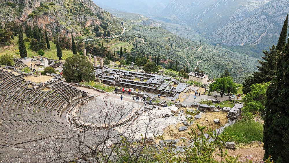 Het heiligdom van Apollo in Delphi met op de voorgrond het theater en op de achtergrond de tempel van Apollo met daarachter het schathuis van de Atheners. (foto: CVR Magazine)
