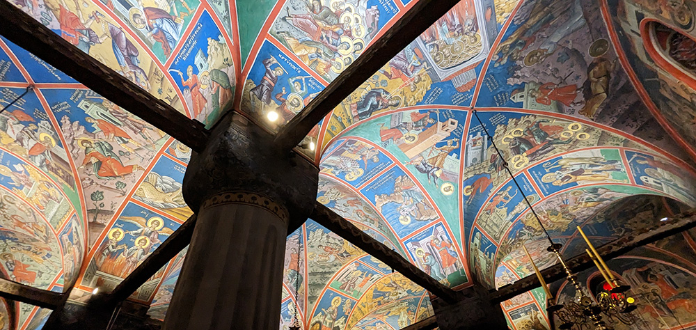Fresco's in het kerkje van het Megalo Meteoron waar allerlei manieren zijn afgebeeld om iemand om zeep te helpen (foto: CVR Magazine)
