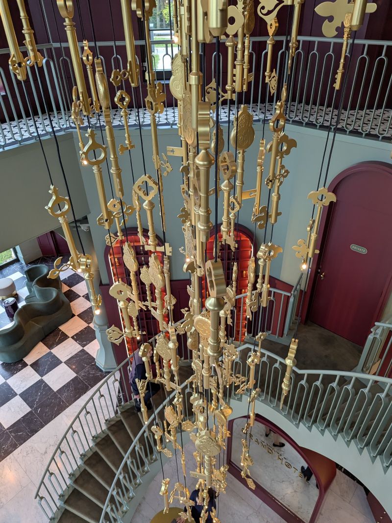 Een wenteltrap met steile treden leidt naar de eerste verdieping, waar honderden sleutels aan het plafond bungelen als een kunstinstallatie. Na een eerste koffie met een Pom Doortje lonkt de boetiekwinkel