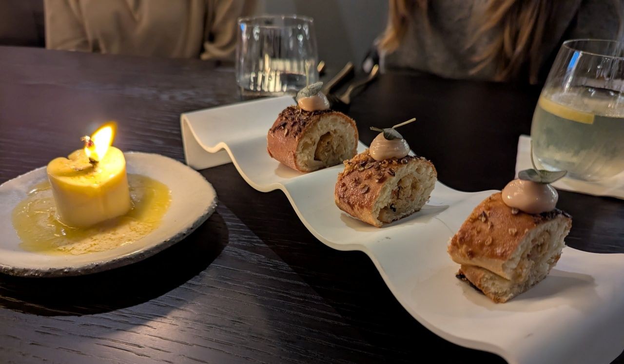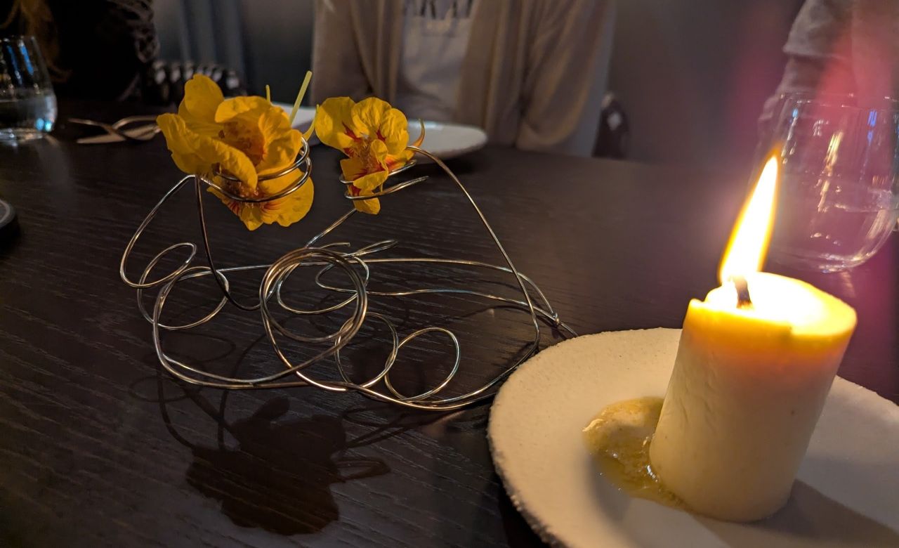 op tafel en een wel heel bijzondere kaars. Hierna volgt al snel een klein glaasje met een gazpacho met