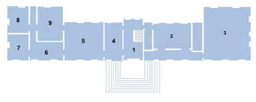 | 1. Ontvangsthal 2. Restaurant 3. Bioscoop | 4. Garderobe 5. Grote salon 6. Galerij | 7. Auditorium (kleine salon) 8. Bibliotheek 9. Leeszaal | |