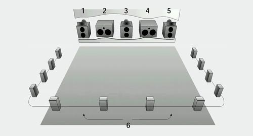De geluidsinstallatie is in staat om Dolby Digital, DTS en THX geluid ten gehore te brengen via een state of the art 5.1 surround geluidsinstallatie met 5 speakers achter het scherm: links (1), rechts (5), center (3) en twee subwoofers (2 en 4). Het surround effect wordt compleet gemaakt met 12 surround speakers die links, rechts en achter de kijker zijn geplaatst (6).